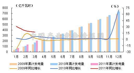 2009-2011年各月累计核电发电量及同比增长变动趋势比较图
