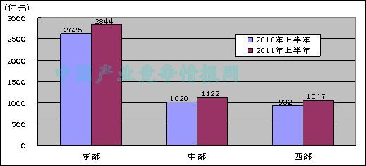 2010-2011年上半年同期东、中、西部电信主营业务收入比较统计图