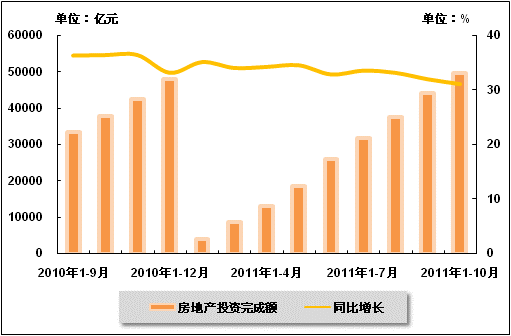 在房地产调控持续推进、市场普遍预期房地产投资将大幅下滑的情况下,2010年以来我国房地产投资增速持续运行在30%以上的高位。国家统计局发布的数据显示:2011年1-10月全国完成房地产开发投资49922.8亿元,同比增长31.1%,增幅同比回落5.4个百分点,比今年1-9月回落0.9个百分点。