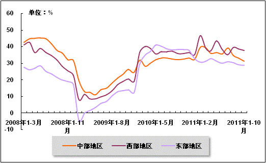 图6 2008年3月-2011年10月累计东、中、西部地区房地产投资增长率变动趋势
