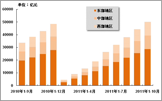 从区域分布上来看,2011年1-10月东部地区完成房地产开发投资28712.0亿元,同比增长28.8%,增幅同比回落9.5个百分点,比今年1-9月回落0.4个百分点;中部地区完成投资10648.5亿元,同比增长31.3%,增幅同比回落1.3个百分点,比今年1-9月回落1.8个百分点;西部地区完成投资10562.4亿元,同比增长37.8%,增幅同比提高2.0个百分点,比今年1-9月回落1.0个百分点。