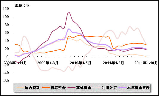 图8 2008年11月-2011年10月累计全国房地产开发企业资金来源构成增长率变动趋势