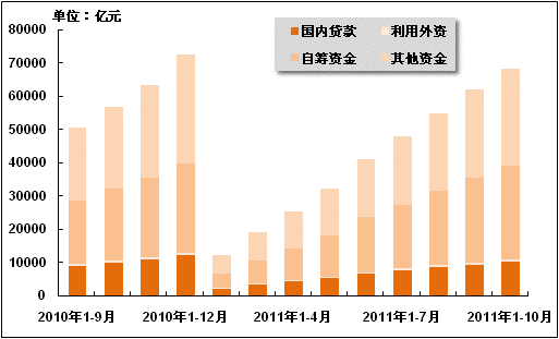 图7 2010年9月-2011年10月累计全国房地产开发企业资金来源构成情况