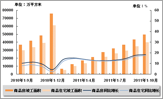 国家统计局发布的数据显示,2011年1-10月全国商品房累计竣工面积49720.7万平方米,同比增长18.5%,增幅同比提高7.1个百分点,比今年1-9月提高0.7个百分点。其中,商品住宅竣工面积39952.8万平方米,同比增长17.6%,增幅同比提高8.6个百分点,比今年1-9月提高1.0个百分点。