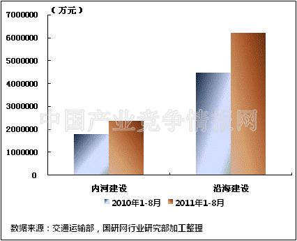 在今年水运投资当中,内河建设和沿海建设投资依然保持较强的增长。2011年1-8月,内河建设和沿海建设完成固定资产投资额分别达到2356982万元和6204653万元。内河建设累计同比上升31.74%,沿海建设累计同比增长39.12%。