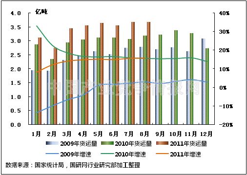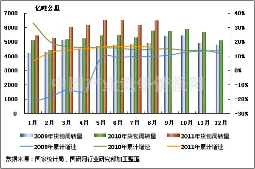 图4 2009-2011年同期水路货运量及当年累计增速比较