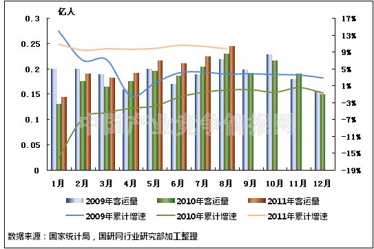 图6 2009-2011年同期水路客运量及当年累计增速比较