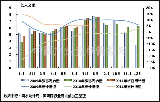 图7 2009-2011年同期水路旅客周转量及当年累计增速比较