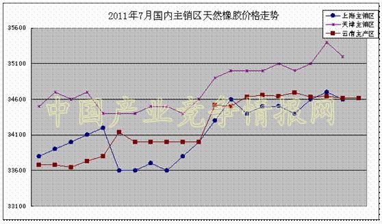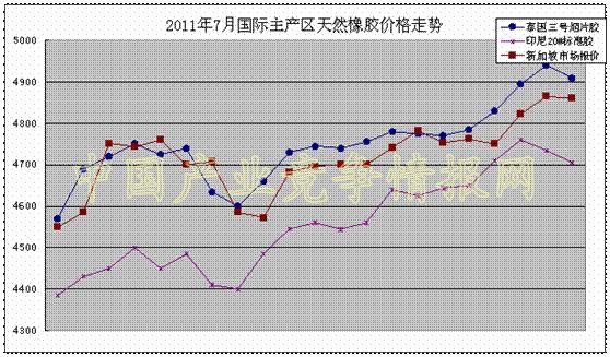 农业部农垦局监测,2011年7月份,泰国3号烟片胶(rss3)和印尼20号标准胶(sir20)价格中上旬窄幅攀升,下旬快速上涨。国内产销两地国产标准胶(scrwf)现货价格也跟随国外价格走势,全月呈震荡上扬的态势,成交量较上月有所增加。
