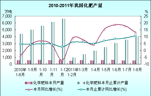 2011年以来,在国内外经济环境十分复杂的情况下,化肥产量保持平稳较快的增势。统计数据显示,1-8月份化肥产量(折纯,下同)4056.53万吨,同比增长10.76%;其中,氮肥产量2831.91万吨(折纯),同比增长4.35%;尿素产量1779.81万吨,同比增长0.29%;磷肥产量960.39万吨,同比增长30.25%;钾肥产量264.23万吨,同比增长25.03%。从具体数据来看: