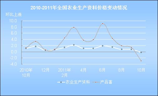 2011年上半年以来我国农业生产资料价格温和上涨,截至2011年10月全国农业生产资料价格较上年同期上涨11.4%。受物价上涨以及养殖成本增加等多种因素的影响,较上年同期价格相比产品畜在各类农业生产资料中价格上涨最快,而产品畜价格在过去一年中涨跌起伏较大,10月当月价格环比下降3%。10月份十种主要农业生产资料价格(上月=100)八升二降,其中,产品畜和农用机油价格呈下降态势。农业生产资料价格环比涨幅较上月收窄0.2个百分点,与工业产品出厂价格相比上涨态势相对温和。