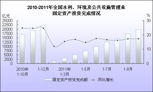 自2011年年初以来,全国水利、环境及公共设施管理业投资形势相对较好,投资增幅一直稳定在10%以上。截至10月份,行业内累计固定资产投资同比增长16.8%。各分类子行业数据显示,目前水利、环境及公共设施管理业运行稳定,整体行业所吸纳固定资产投资额及外商投资额较上年同期均有所增长。