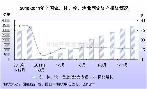 2011年全国农、林、牧、渔业固定资产投资增长较上年大幅回落。2011年1-12月,全国农、林、牧、渔业固定资产投资同比增长25%,较上年同期增幅扩大6.8个百分点,较同期全国各行业固定资产投资平均水平高出1.2个百分点。截至12月份,全国农、林、牧、渔业完成固定资产总额较上年同期增加2826.3亿元,达6792.4亿元,占同期全国城镇固定资产投资总额2.25%,该比重较上年同期上升0.61个百分点。农、林、牧、渔业生产受季节性影响较为明显,2011年前12个月,全国农、林、牧、渔业固定资产投资稳步增长,完成情况良好。
