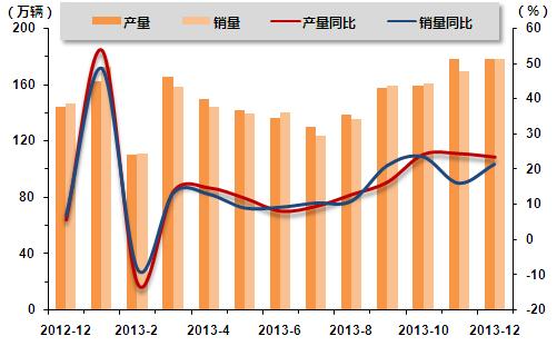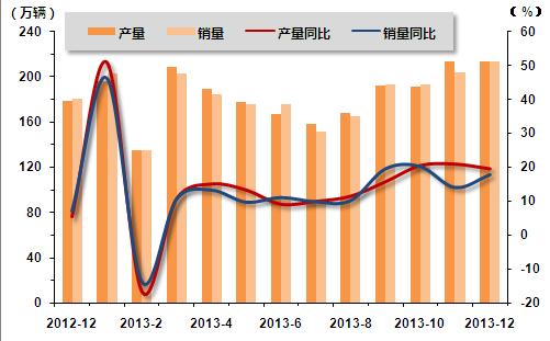 2013年12月,汽车产销保持稳定增长,当月产销再创月度新高。12月,汽车生产213.79万辆,环比增长0.17%,同比增长19.78%;销售213.42万辆,环比增长4.42%,同比增长17.92%。继11月产销创新记录后,再次刷新月度产销新记录。2013年,汽车产销双双超过2000万辆,再创全球产销最高记录。2013年,汽车产销2211.68万辆和2198.41万辆,同比增长14.76%和13.87%。