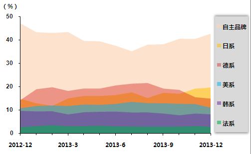 单位:% 自主品牌 日系 德系 美系 韩系 法系 2012年12月 47.07 14.85 14.37 10.92 9.7 2.76 2013年1月 43.31 12.98 19.01 11.84 9.45 3.15 2013年2月 42.99 11.85 19.86 12.05 9.52 3.53 2013年3月 43.38 15.03 18.28 11.84 8.16 3.09 2013年4月 39.62 16.09 19.33 12.48 9.11 3.14 2013年5月 39.43 16.04 19.31 12.35 9.31 3.31 2013年6月 37.53 16.46 20.64 12.72 9.38 3.04 2013年7月 35.19 17.61 21.38 13.6 9.01 2.99 2013年8月 38.01 15.21 21.66 13.08 9.04 2.91 2013年9月 38.19 17.45 19.29 12.99 8.54 2.93 2013年10月 40.52 16.99 18.7 12.8 7.82 2.94 2013年11月 40.47 19.18 15.59 12.66 8.55 3.17 2013年12月 42.76 19.68 14.98 11.07 8.2 2.87