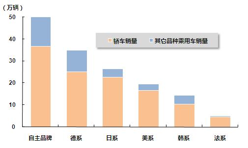 2013年12月,中国品牌乘用车市场占有率环比呈一定增长,同比继续下降。当月共销售75.98万辆,环比增长10.69%,同比增长10.34%,占乘用车销售总量的42.76%,占有率比上月增长2.29个百分点,比上年同期下降4.31个百分点。日系、德系、美系、韩系和法系乘用车分别销售34.96万辆、26.62万辆、19.67万辆、14.57万辆和5.10万辆,与上月相比,美系和法系销量有所下降,其它外国品牌各有增长;分别占乘用车销售总量的19.68%、14.98%、11.07%、8.20%和2.87%,与上月相比,日系品牌占有率环比微增,其它外国品牌略降。