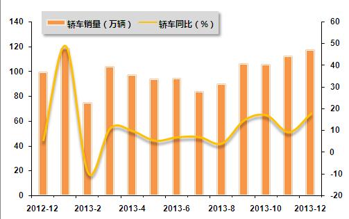 2013年12月,乘用车生产178.22万辆,环比下降0.07%,同比增长23.57%;销售177.70万辆,环比增长4.76%,同比增长21.47%。12月,乘用车市场需求保持稳定增长,销量刷新月度历史最高记录。2013年全年,乘用车产销分别完成1808.52万辆和1792.89万辆,同比增长16.50%和15.71%,再创历史新高。