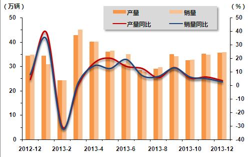 单位:辆,% 生产 销售 产量 环比 同比 销量 环比 同比 2012年12月 342594 4.01 4.52 347030 5.24 8.2 2013年1月 343305 0.21 39.58 308963 -10.97 34.75 2013年2月 242149 -29.47 -30.25 242727 -21.44 -31.42 2013年3月 428210 76.68 0.81 449614 85.15 2.51 2013年4月 400773 -6.41 17.04 400295 -10.97 14.9 2013年5月 360780 -10.03 20.39 364652 -8.94 12.88 2013年6月 311570 -13.64 14.36 350631 -3.85 19.53 2013年7月 284535 -8.68 12.78 278694 -20.52 7.54 2013年8月 289410 1.69 6.04 295667 6.07 6.99 2013年9月 350153 20.99 13.52 342308 15.77 13.3 2013年10月 324238 -7.4 5.68 326936 -4.49 6.48 2013年11月 350932 8.23 6.54 347614 6.32 5.42 2013年12月 355716 1.36 3.83 357245 2.77 2.95