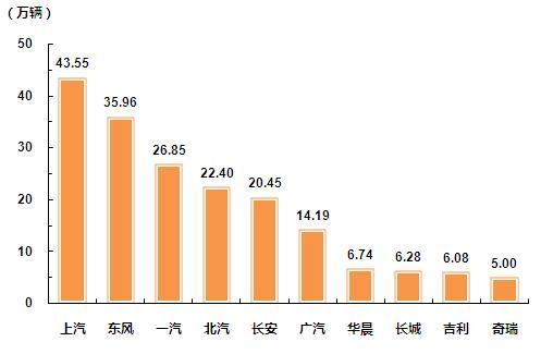 2013年12月,汽车销量排名前十位的生产企业依次为:上汽、东风、一汽、北汽、长安、广汽、华晨、长城、吉利和奇瑞,分别销售43.55万辆、35.96万辆、26.95万辆、22.40万辆、20.45万辆、14.19万辆、6.740万辆、6.28万辆、6.08万辆和5.00万辆。12月,上述十家企业共销售187.50万辆,占汽车销售总量的87.85%,比重比上月下降0.54个百分点。