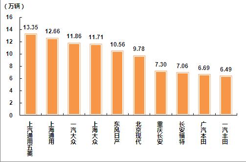12月,乘用车销量排名前十位的企业为:上汽通用五菱、上海通用、一汽大众、上海大众、东风日产、北京现代、重庆长安、长安福特、广汽本田和一汽丰田,分别销售13.35万辆、12.66万辆、11.86万辆、11.71万辆、10.56万辆、9.78万辆、7.30万辆、7.06万辆、6.69万辆和6.49万辆。12月,上述十家企业共销售97.46万辆,占乘用车销售总量的54.85%,比上月下降2.20个百分点。