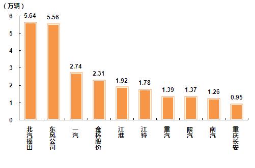 12月,商用车销量排名前十位的企业依次为:北汽福田、东风公司、一汽、金杯股份、江淮、江铃、重汽、陕汽、南汽和重庆长安,分别销售5.64万辆、5.56万辆、2.74万辆、2.31万辆、1.92万辆、1.78万辆、1.39万辆、1.37万辆、1.26万辆和0.95万辆。12月,上述十家企业共销售24.92万辆,占商用车销售总量的69.76%,较上月下降1.70个百分点。