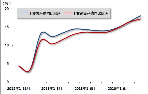 2012年11月-2013年11月汽车行业重点企业工业总产值、工业销售产值增速变动走势图