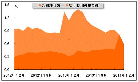 图 4 2012年2月-2014年2月医药行业利用外资合同项目和金额占比情况