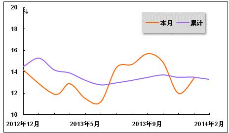 图 10 2012年12月-2014年2月医药行业累计出口交货值及其增速走势