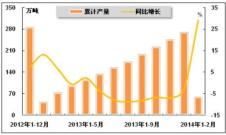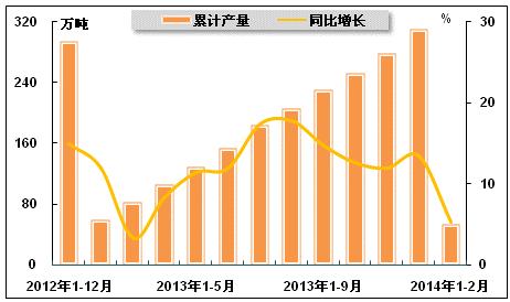 图 6 2012年12月-2014年2月化学药品原药产量及其增速走势