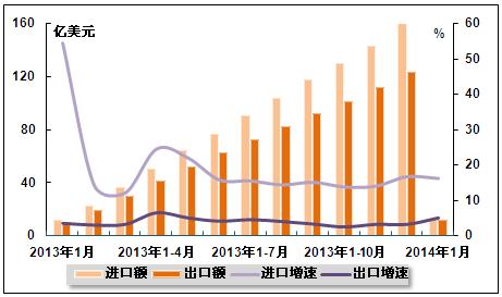 图 9 2013年1月-2014年1月医药品进出口额及其增速走势