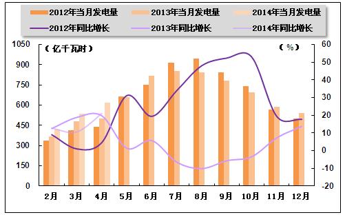 2012-2014年各月总发电量及同比增长率变动趋势比较图