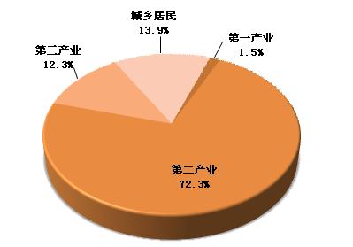 用电结构继续调整。国家能源局数据显示,2014年1-4月份,第一产业用电量254亿千瓦时,同比下降4.9%。第二产业用电量12,398亿千瓦时,同比增长5.0%。第三产业用电量2,116亿千瓦时,同比增长6.5%。城乡居民生活用电量2,378亿千瓦时,同比增长6.6%。第一、第二、第三产业及城乡居民累计用电量分别占全社会用电量的比重为1.5%、72.3%、12.3%、13.9%,与上年同期相比,第一产业、第二产业用电量占比均下降0.2个百分点,第三产业、城乡居民生活用电量占比分别提高0.1个百分点、0.3个百分点。