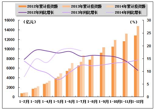 2014年1-7月份,电力、热力生产和供应业固定资产投资增速有所放缓,但仍高于全社会固定资产投资。国家统计局数据显示,2014年1-7月份,全国固定资产投资(不含农户)259,493亿元,同比名义增长17.0%,增速与今年1-6月份相比回落0.3个百分点,与上年同期相比回落3.1个百分点。其中,电力、热力生产和供应业固定资产投资完成额为8,678亿元,同比增长18.1%,增速与今年1-6月份相比回落0.9个百分点,与上年同期相比上升5.7个百分点;占全社会固定资产投资的比重为3.3%,与今年1-6月份及上年同期均持平。