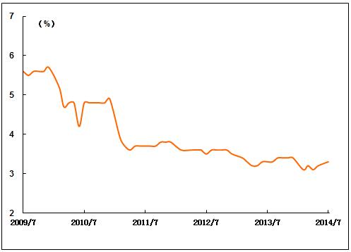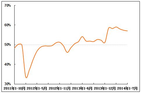 2009年7月-2014年7月电力行业各月累计投资占全国总投资比重走势