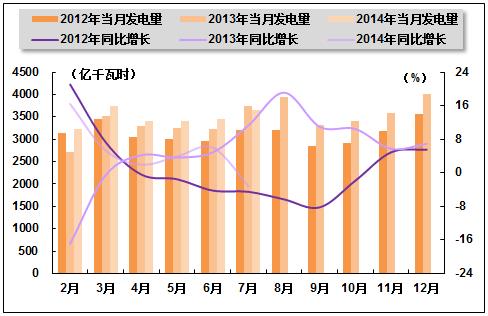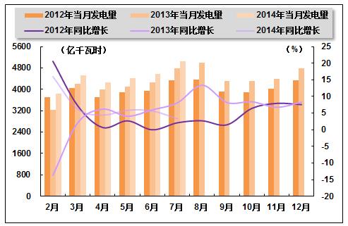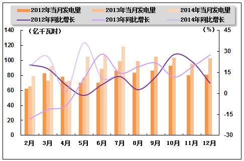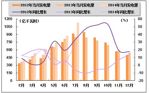 2012-2014年各月总发电量及同比增长率变动趋势比较