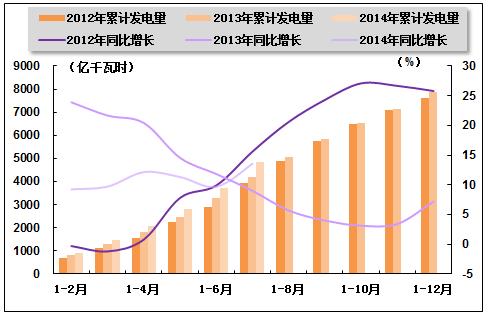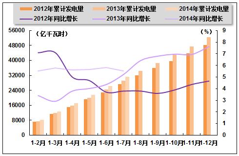 2012-2014年各月累计总发电量及同比增长率变动趋势比较