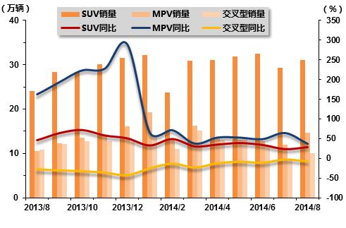 2013年8月-2014年8月SUV、MPV、交叉型汽车销售走势图