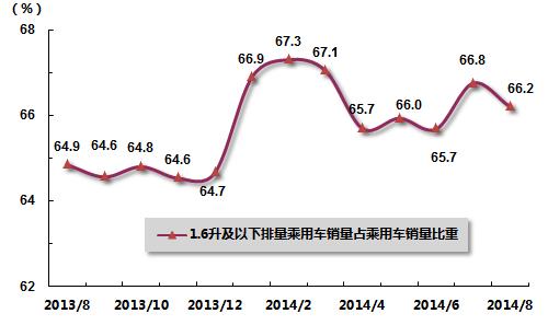 8月,小排量乘用车销量环比、同比实现较快增长,市场份额较上月略降,但较上年同期有所提高。1.6升及以下排量的乘用车8月共销售97.23万辆,环比增长7.23%,同比增长10.77%;1.6升及以下排量乘用车销量占乘用车总销量比重为66.22%,比上月下降0.55个百分点,比上年同期高1.36个百分点。