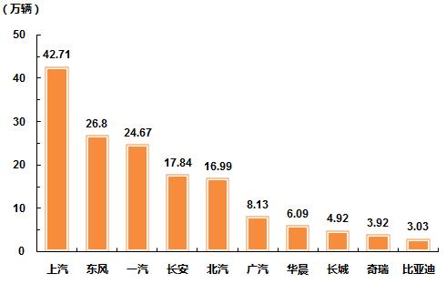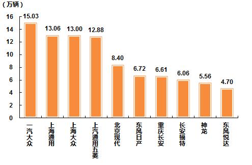 8月,乘用车销量排名前十位的企业为:一汽大众、上海通用、上海大众、上汽通用五菱、北京现代、东风日产、重庆长安、长安福特、神龙和东风悦达,分别销售15.03万辆、13.06万辆、13.00万辆、12.88万辆、8.40万辆、6.72万辆、6.61万辆、6.06万辆、5.56万辆和4.70万辆。8月,上述十家企业共销售92.02万辆,占乘用车销售总量的62.68%,比上月下降2.04个百分点。