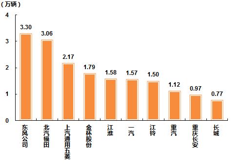 8月,商用车销量排名前十位的企业依次为:东风公司、北汽福田、上汽通用五菱、金杯股份、江淮、一汽、江铃、重汽、重庆长安和长城,分别销售3.30万辆、3.06万辆、2.17万辆、1.79万辆、1.58万辆、1.57万辆、1.50万辆、1.12万辆、0.97万辆和0.77万辆。8月,上述十家企业共销售17.83万辆,占商用车销售总量的72.07%,较上月略降0.14个百分点。