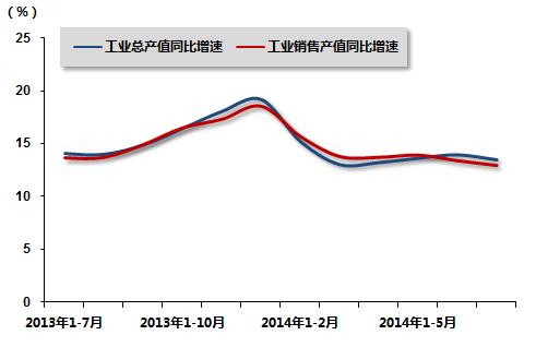 2013年7月-2014年7月汽车行业重点企业工业总产值、工业销售产值增速变动走势图