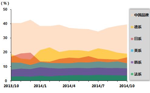 2013年10月-2014年10月乘用车分系列市场份额变化情况图