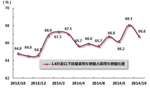 10月,小排量乘用车销售形势好于上年同期,销量实现较快增长,市场份额同比提高。1.6升及以下排量的乘用车10月共销售114.16万辆,环比下降1.15%,同比增长9.68%;1.6升及以下排量乘用车销量占乘用车总销量比重为66.80%,比上月低1.29个百分点,比上年同期高1.98个百分点。