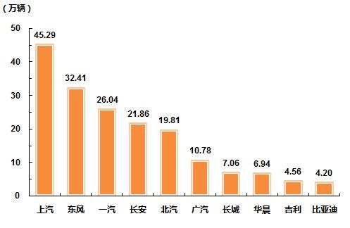 2014年10月,汽车销量排名前十位的生产企业依次为:上汽、东风、一汽、长安、北汽、广汽、长城、华晨、吉利和比亚迪,分别销售45.29万辆、32.41万辆、26.04万辆、21.86万辆、19.81万辆、10.78万辆、7.06万辆、6.94万辆、4.56万辆和4.20万辆。10月,上述十家企业共销售178.95万辆,占汽车销售总量的90.05%,比重比上月略降0.34个百分点。