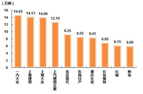 10月,乘用车销量排名前十位的企业为:一汽大众、上海通用、上海大众、上汽通用五菱、北京现代、东风日产、重庆长安、长安福特、长城和神龙,分别销售14.65万辆、14.13万辆、14.00万辆、12.70万辆、9.25万辆、8.55万辆、8.41万辆、6.95万辆、6.15万辆和6.00万辆。10月,上述十家企业共销售100.79万辆,占乘用车销售总量的58.98%,比上月下降2.49个百分点。