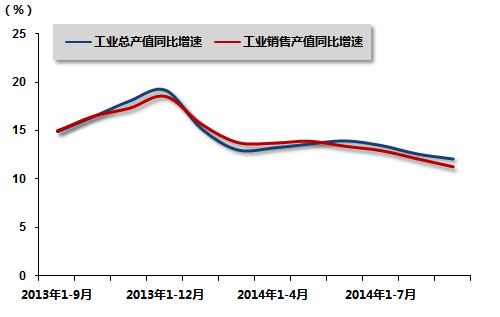 2013年9月-2014年9月汽车行业重点企业工业总产值、工业销售产值增速变动走势图