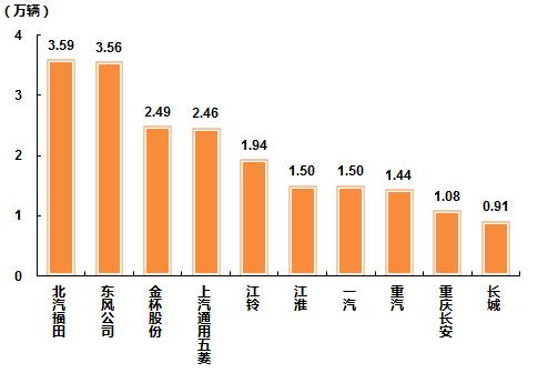 10月,商用车销量排名前十位的企业依次为:北汽福田、东风公司、金杯股份、上汽通用五菱、江铃、江淮、一汽、重汽、重庆长安和长城,分别销售3.59万辆、3.56万辆、2.49万辆、2.46万辆、1.94万辆、1.50万辆、1.50万辆、1.44万辆、1.08万辆和0.91万辆。10月,上述十家企业共销售20.47万辆,占商用车销售总量的73.55%,较上月下降0.13个百分点。