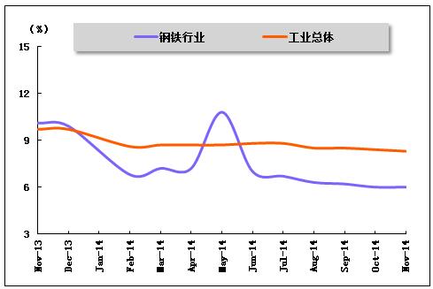 2014年11月份我国钢铁业工业增加值累计增速为6.0%,与10月份持平,较2013年同期下降4.1个百分点;其中11月份钢铁业增加值同比增长5.9%,较10月份提高1.2个百分点,较2013年同期回落1.9个百分点。11月份钢铁行业单月增加值增速出现小幅回升,钢铁生产速度有所提高,当前国内钢铁行业仍然处于化解产能阶段,生产的提速将使供给压力有所回升。