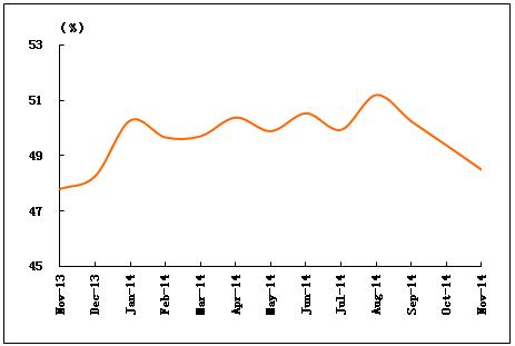 图 3 2013年11月-2014年11月我国粗钢产量在全球粗钢总产量中占比变化情况