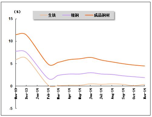 图 2 2013年11月-2014年11月主要钢铁产品产量累计同比增长趋势